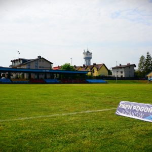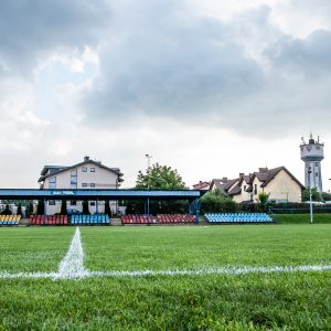 - pełnowymiarowe boisko z naturalną murawą o wymiarach 100 x 57 m, automatycznym systemem nawadniania i trybunami z 391 miejsc siedzących (w tym 235 pod dachem)