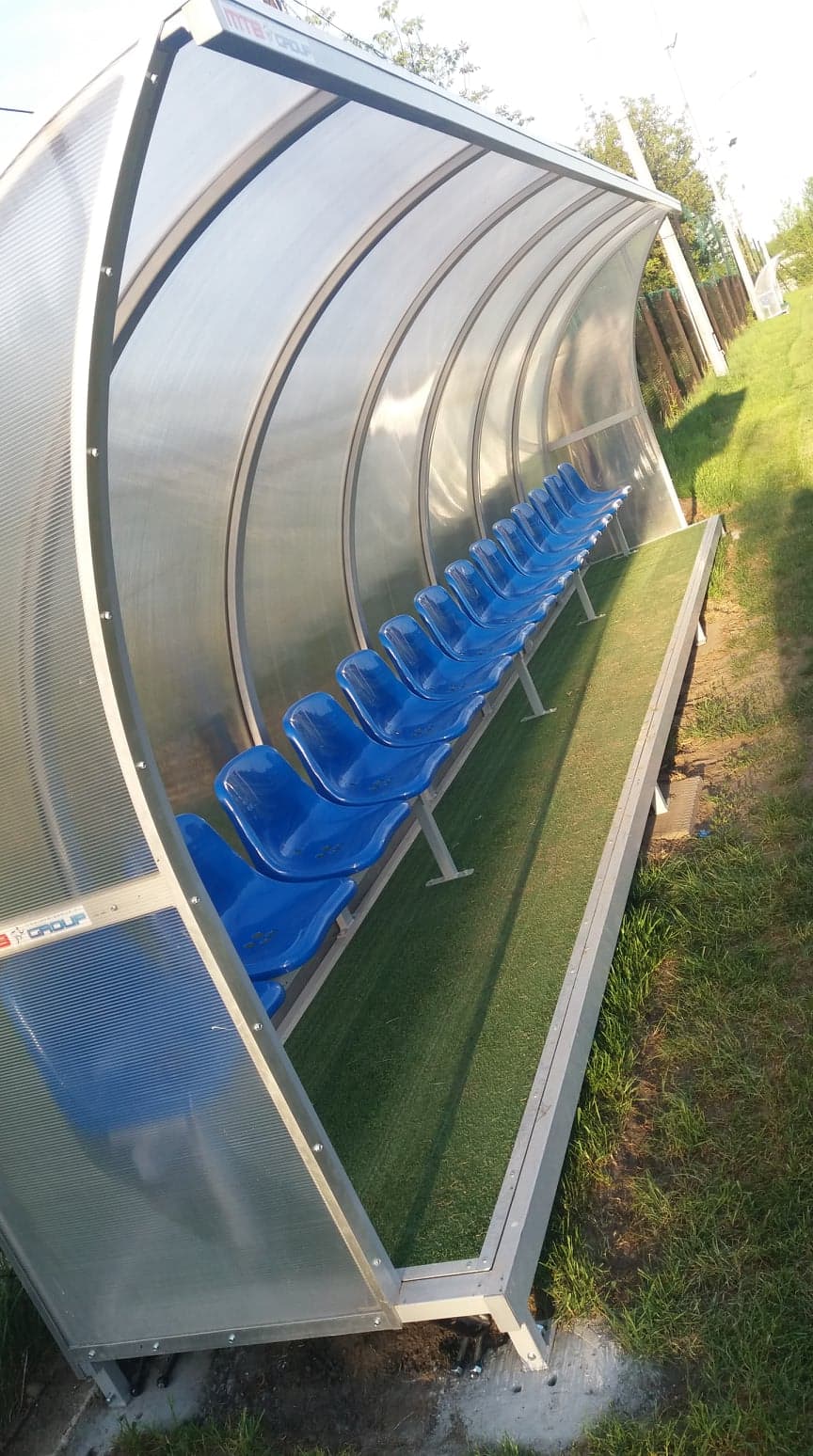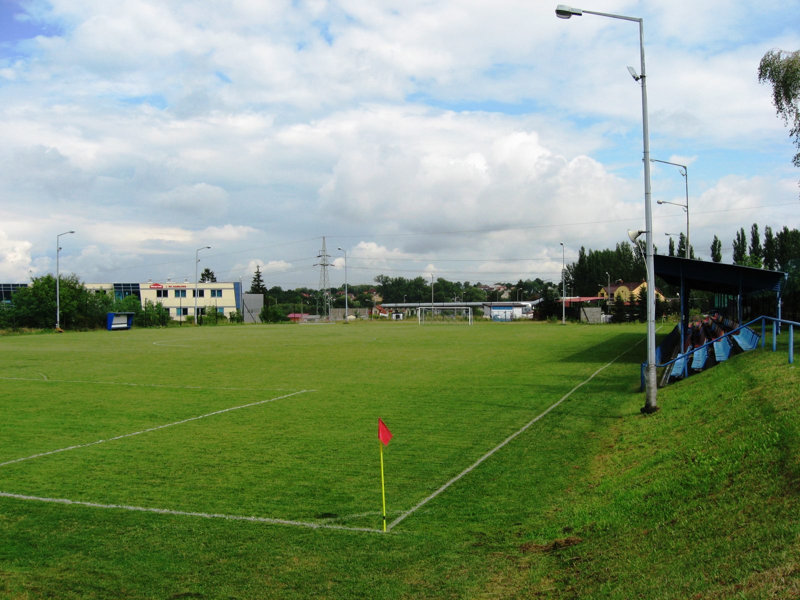 - pełnowymiarowe boisko z naturalną murawą o wymiarach 100 x 57 m, automatycznym systemem nawadniania i trybunami z 391 miejsc siedzących (w tym 235 pod dachem)